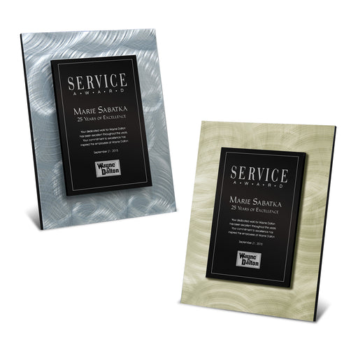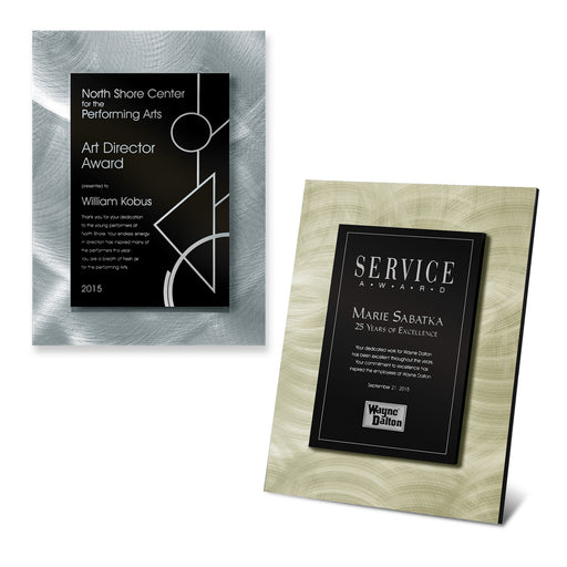 25M PrintingAvailable in 3 sizes.8" x 10" Features an eye-catching gunmetal black plate stepped up on a swirled metal plate on 1/2" backer plaque to lend adde...
