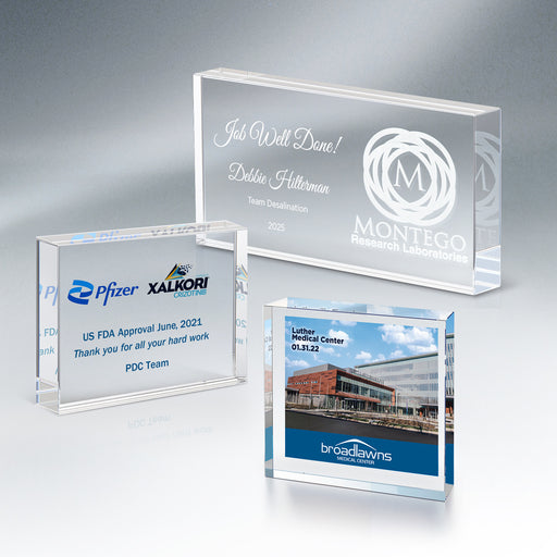 25M PrintingAvailable in 3 sizes. Freestanding Lucite block will show off your logo beautifully. Personals not included Material : Lucite Shape : Squ...