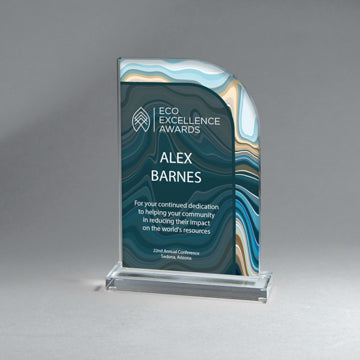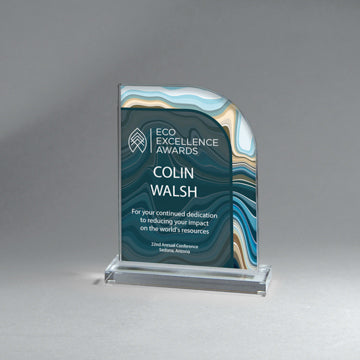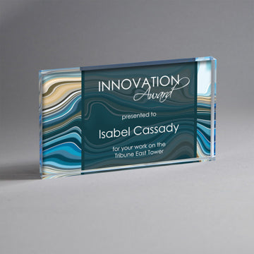 25M PrintingAvailable in 3 sizes.6" x 10 3/4" x 2" Beautiful vibrant translucent swirl designs of aqua/green/blue on thick Lucite on clear base. Imprin...