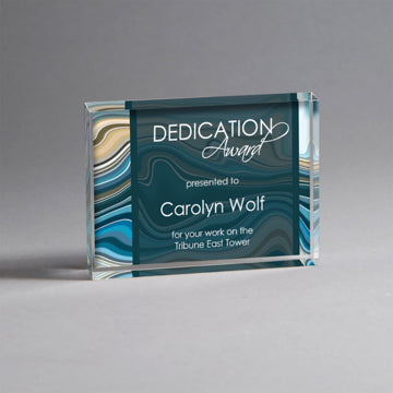 25M PrintingAvailable in 3 sizes.6" x 9 1/4" x 2" Beautiful vibrant translucent swirl designs of aqua/green/blue on thick Lucite on clear base. Imprint ...