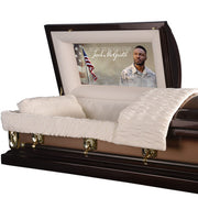 Made to order and to your specific size. This elegantly designed custom casket panels offers you a truly memorable backdrop for your loved ones photo special message. The cap panel is precisely sized and made especially for your casket. The cap panel is form fitting and easily placed into the casket. Personalized with your submitted photo and special text.