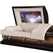 Made to order and to your specific size. This elegantly designed custom casket panels offers you a truly memorable backdrop for your loved ones photo special message. The cap panel is precisely sized and made especially for your casket. The cap panel is form fitting and easily placed into the casket. Personalized with your submitted photo and special text.