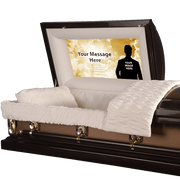 Made to order and to your specific size.  This elegantly designed custom casket panels offers you a truly memorable backdrop for your loved ones photo special message.  The cap panel is precisely sized and made especially for your casket.  The cap panel is form fitting and easily placed into the casket.  Personalized with your submitted photo and special text.