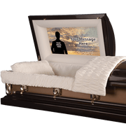 Made to order and to your specific size. This elegantly designed custom casket panels offers you a truly memorable backdrop for your loved ones photo special message. The cap panel is precisely sized and made especially for your casket. The cap panel is form fitting and easily placed into the casket. Personalized with your submitted photo and special text.