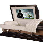 Made to order and to your specific size. This elegantly designed custom casket panels offers you a truly memorable backdrop for your loved ones photo special message. The cap panel is precisely sized and made especially for your casket. The cap panel is form fitting and easily placed into the casket. Personalized with your submitted photo and special text.