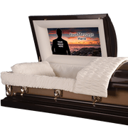 Made to order and to your specific size.  This elegantly designed custom casket panels offers you a truly memorable backdrop for your loved ones photo special message.  The cap panel is precisely sized and made especially for your casket.  The cap panel is form fitting and easily placed into the casket.  Personalized with your submitted photo and special text.