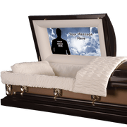 Made to order and to your specific size. This elegantly designed custom casket panels offers you a truly memorable backdrop for your loved ones photo special message. The cap panel is precisely sized and made especially for your casket. The cap panel is form fitting and easily placed into the casket. Personalized with your submitted photo and special text.