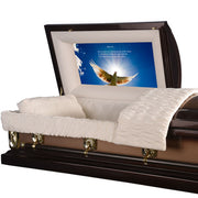Made to order and to your specific size. This elegantly designed custom casket panels offers you a truly memorable backdrop for your loved ones photo special message. The cap panel is precisely sized and made especially for your casket. The cap panel is form fitting and easily placed into the casket.