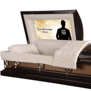Made to order and to your specific size.  This elegantly designed custom casket panels offers you a truly memorable backdrop for your loved ones photo special message.  The cap panel is precisely sized and made especially for your casket.  The cap panel is form fitting and easily placed into the casket.  Personalized with your submitted photo and special text.