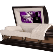 Made to order and to your specific size. This elegantly designed custom casket panels offers you a truly memorable backdrop for your loved ones photo special message. The cap panel is precisely sized and made especially for your casket. The cap panel is form fitting and easily placed into the casket. Personalized with your submitted photo and special text.