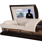 Made to order and to your specific size. This elegantly designed custom casket panels offers you a truly memorable backdrop for your loved ones photo special message. The cap panel is precisely sized and made especially for your casket. The cap panel is form fitting and easily placed into the casket. Personalized with your submitted photo and special text.