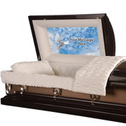 Made to order and to your specific size. This elegantly designed custom casket panels offers you a truly memorable backdrop for your loved ones photo special message. The cap panel is precisely sized and made especially for your casket. The cap panel is form fitting and easily placed into the casket. Personalized with your submitted photo and special text.