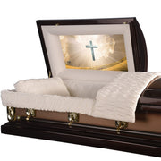 Made to order and to your specific size.  This elegantly designed custom casket panels offers you a truly memorable backdrop for your loved ones photo special message.  The cap panel is precisely sized and made especially for your casket.  The cap panel is form fitting and easily placed into the casket.
